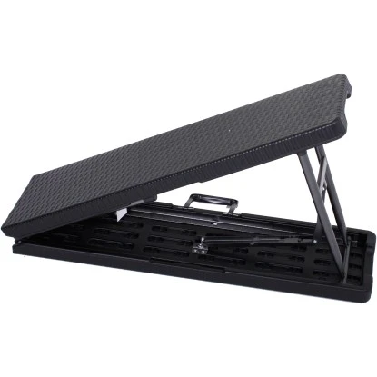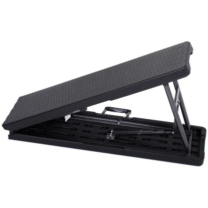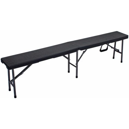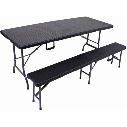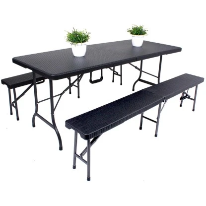 Das Tisch-Set Ventana besteht aus zwei Bänken und einem Tisch. Alle Set-Teile sind aus schwarzem Kunststoff in Rattanoptik und einem grauen Stahlgestell gefertigt. Sowohl Bänke als auch der Tisch lassen sich mühelos zusammenklappen, so dass das Set problemlos transportiert werden kann.