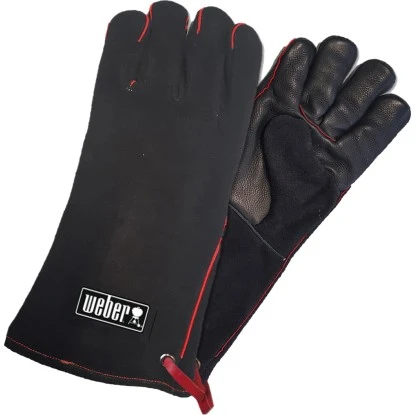 Die Weber Leder-Grillhandschuhe aus hochwertigem Leder und im Desing von Metallarbeiter-Handschuhen schützen vor hoher Hitze und sorgen für einen festen Griff.